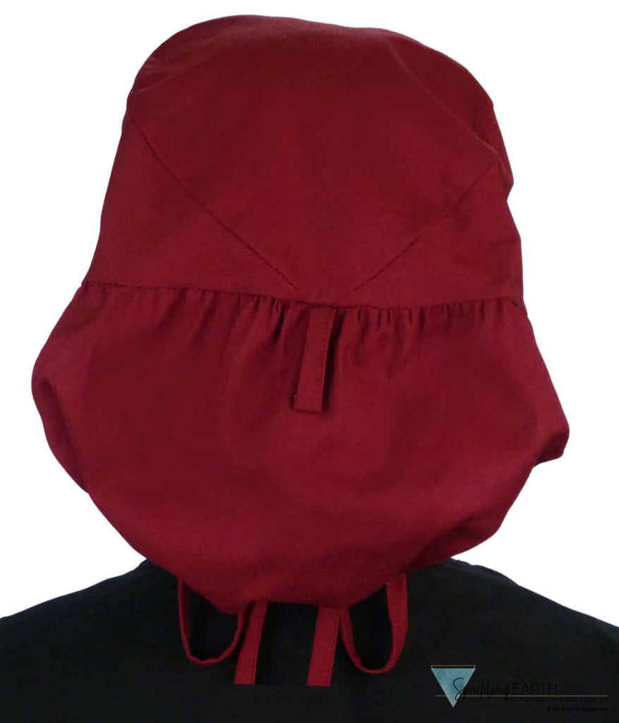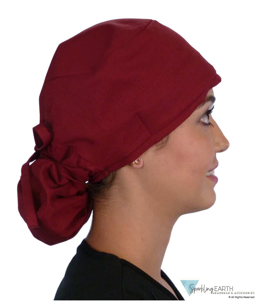 Big Hair Ponytail Surgical Scrub Caps by Sparkling EARTH are expertly designed for those with longer hair. The Red Burgundy Wine Ponytail Scrub Cap features a flat front and tailored back, these caps offer two versatile styling options. Secure your hair in a ponytail using the built-in loop or let it flow freely with a bow tied in the back.