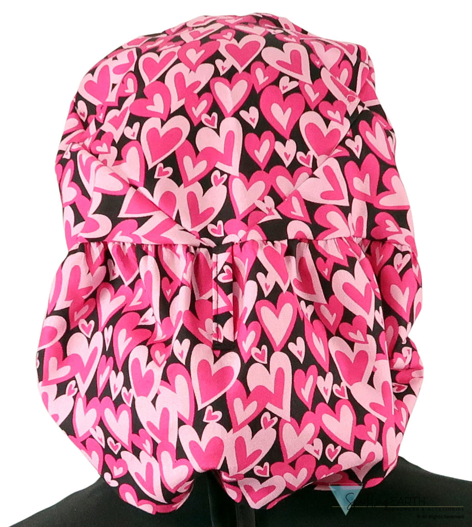 Big Hair Ponytail Surgical Scrub Cap - Scrub Cap for Long Hair - Hearts Forever with Black Ties