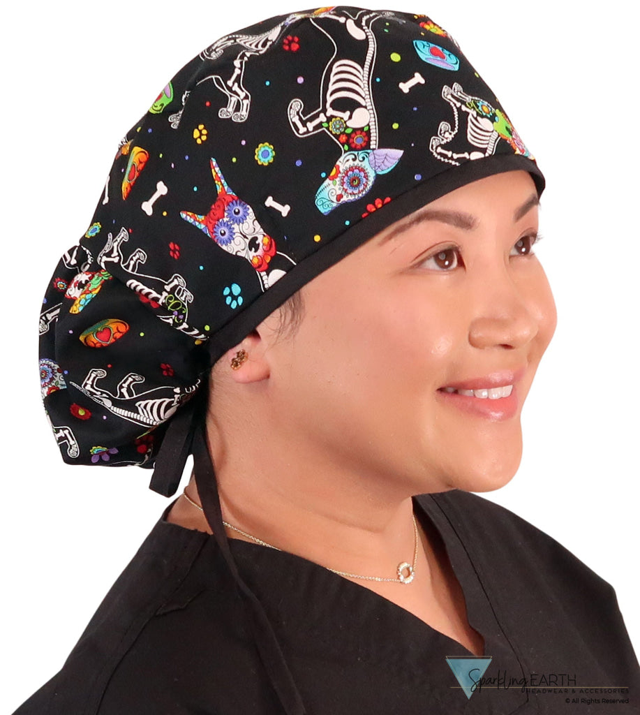 Big Hair Ponytail Surgical Scrub Cap - Perfect Scrub Cap for Long Hair - X - Ray Dogs with Black Ties