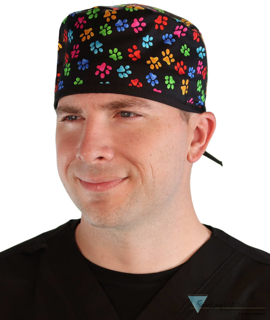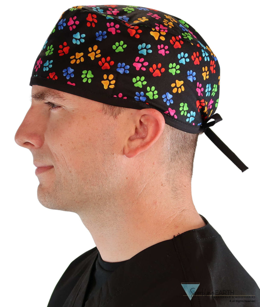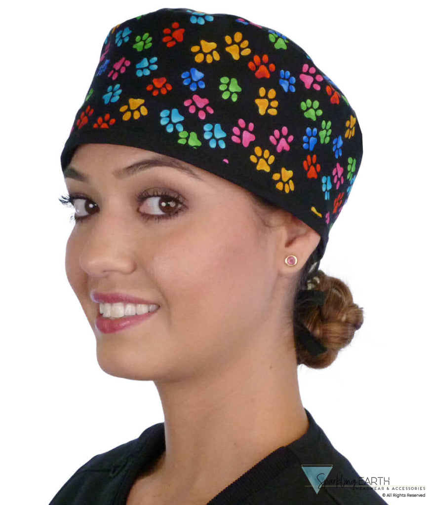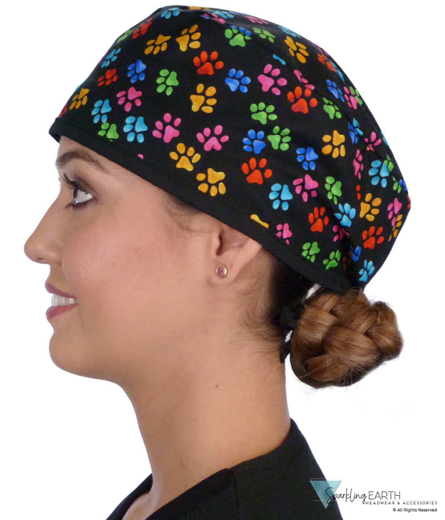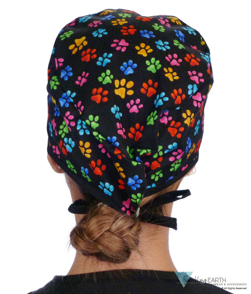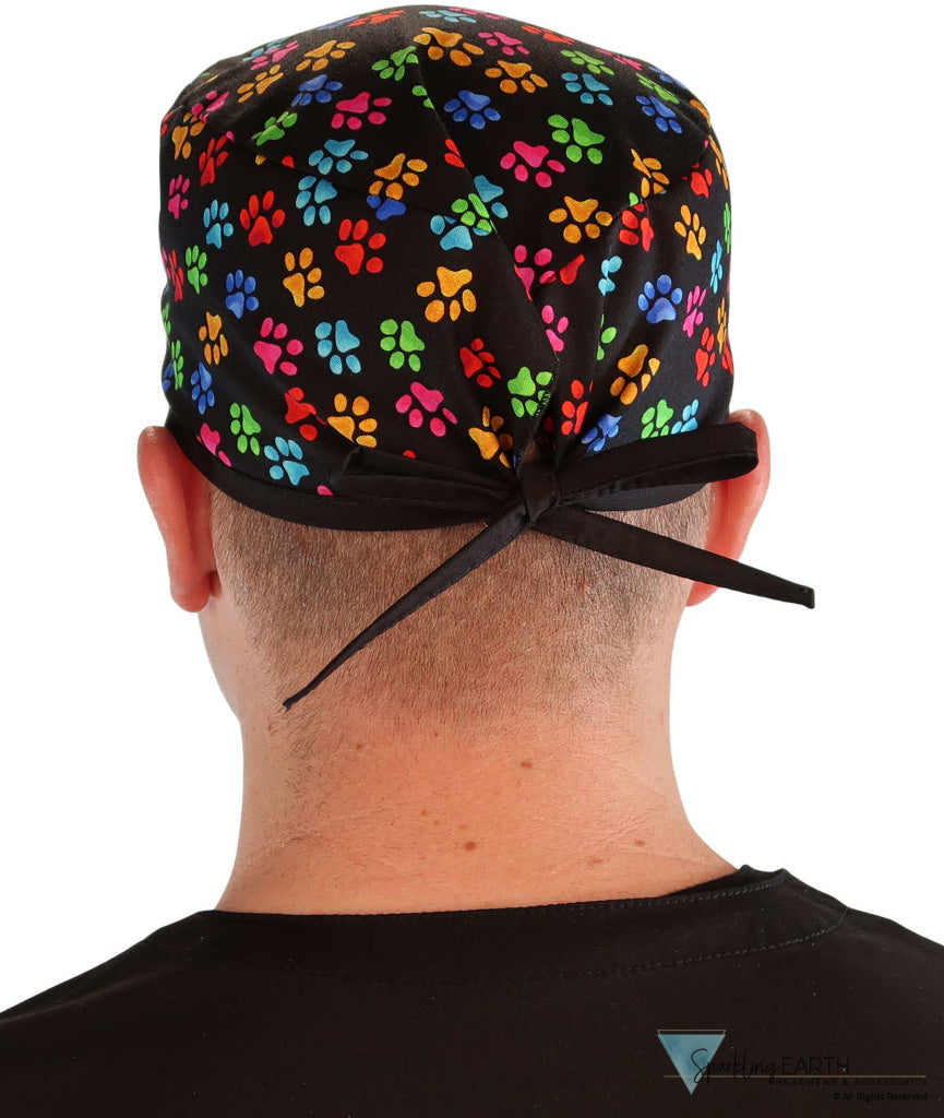 Classic Cotton Surgical Scrub Cap - American-Made with Sweatband - Multi Color Paws with Black Ties