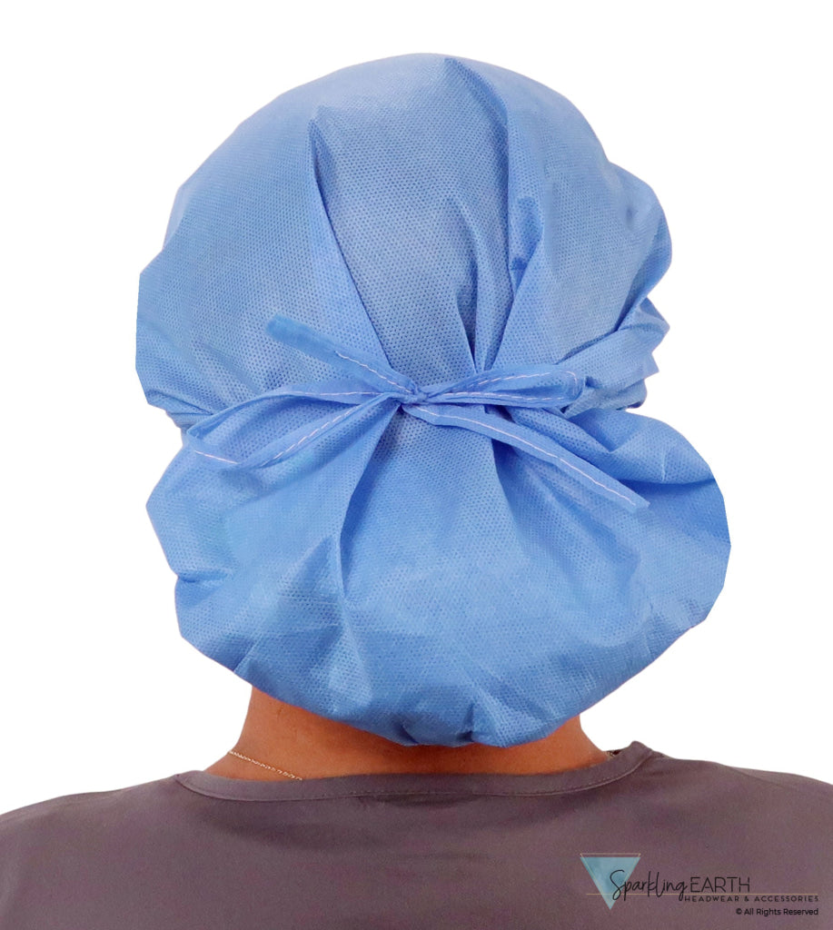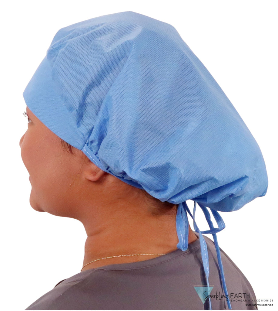 Sparkling Earth\'s Disposable Banded Bouffant Medical Scrub Caps are designed in the USA. Disposable Banded Bouffant Medical Scrub Caps are designed for comfort and patterned after our standard fabric banded bouffant (214). Disposable Banded Bouffants have a flat band at front and a roomy interior that can be tied loosely in a bow or tied up into a ponytail. Disposable Banded Bouffant Scrub Caps are sure to distinguish you while at work and to keep your hair from interfering with your work. Disposable Banded Bouffants are made from a sturdy yet lightweight non-woven polypropylene material with built in ties to adjust the fit.