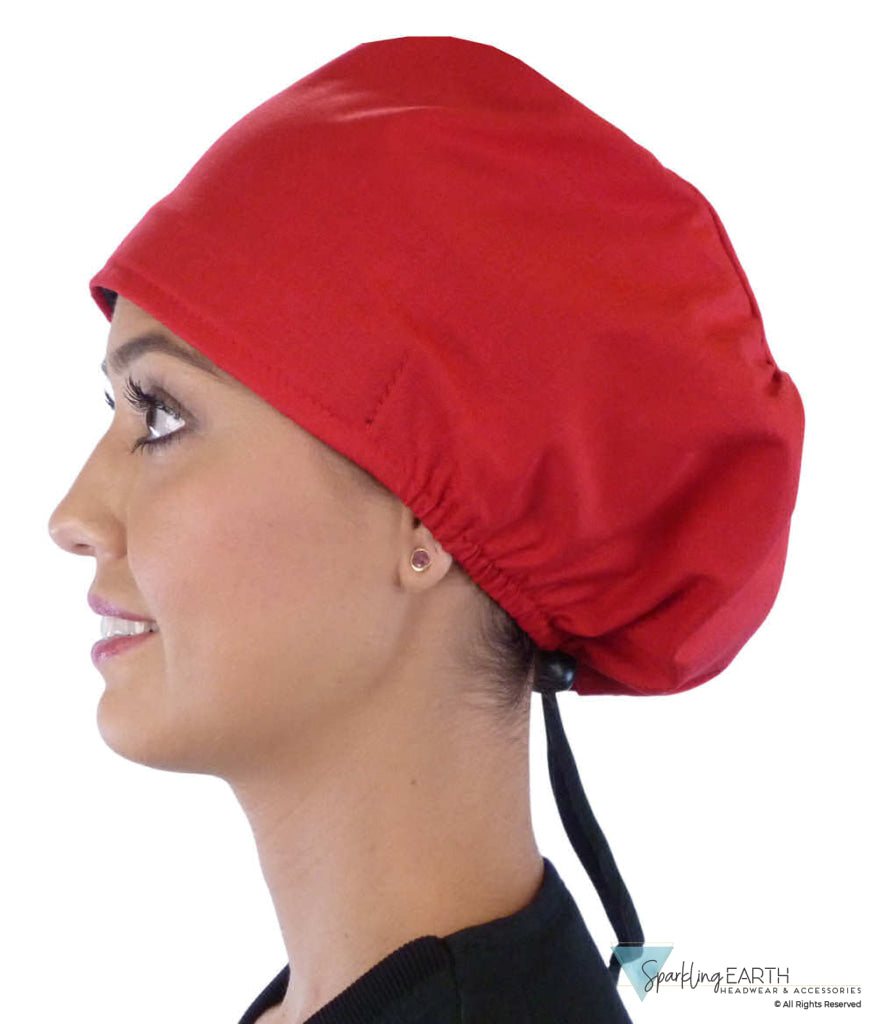 • European Scrub Cap: A sleek, close-fitting cap with a roomy back for long hair, offering a stylish, professional look with adjustable comfort.