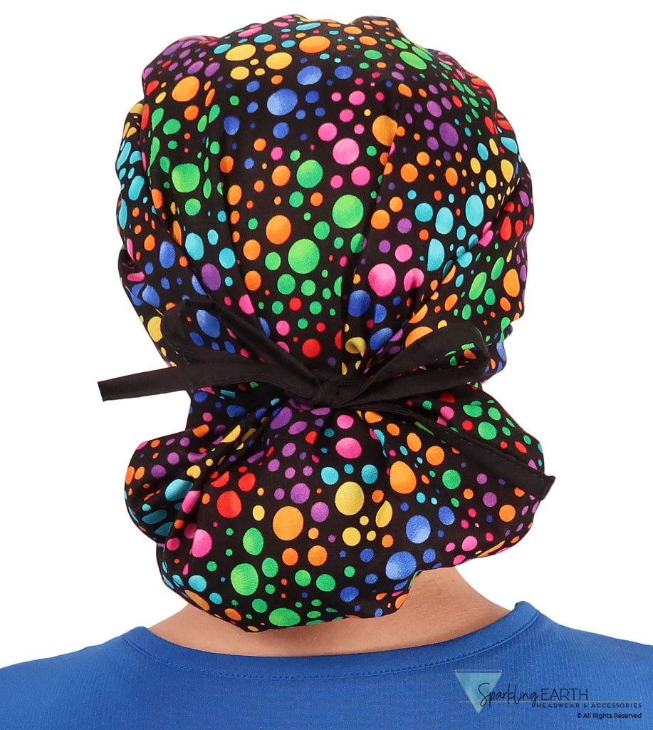 Stylish American Made Banded Bouffant Ponytail Scrub Cap - Multi Color Dots with Black Ties