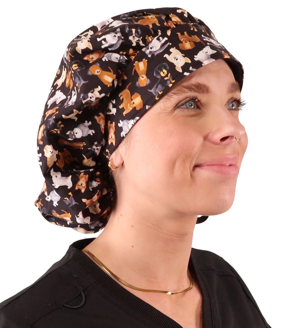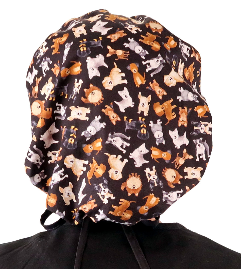 Stylish American Made Banded Bouffant Ponytail Scrub Cap - Puppy Parade with Black Ties
