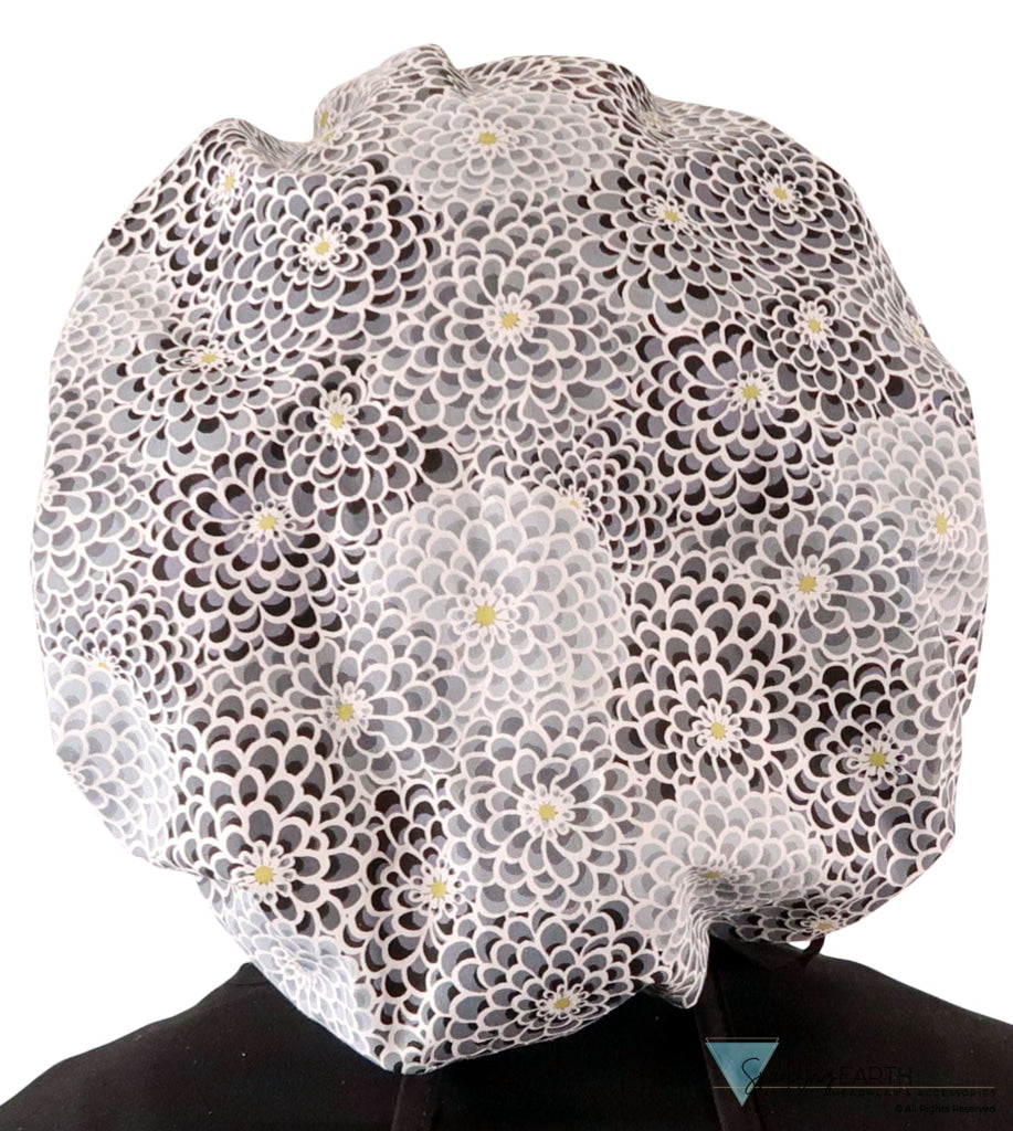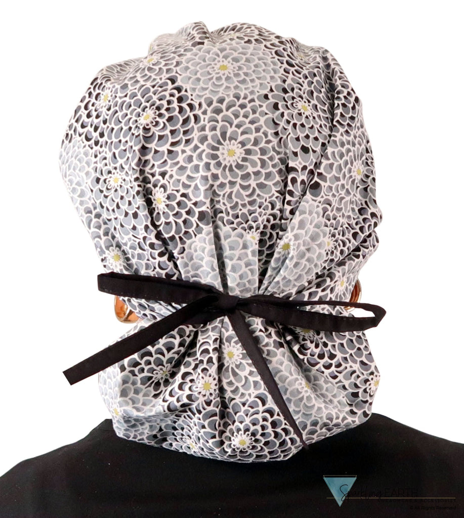 Stylish American Made Banded Bouffant Ponytail Scrub Cap - Dazzling Dahlias Black and Grey with Black Ties