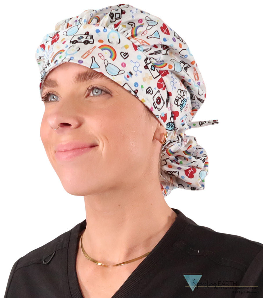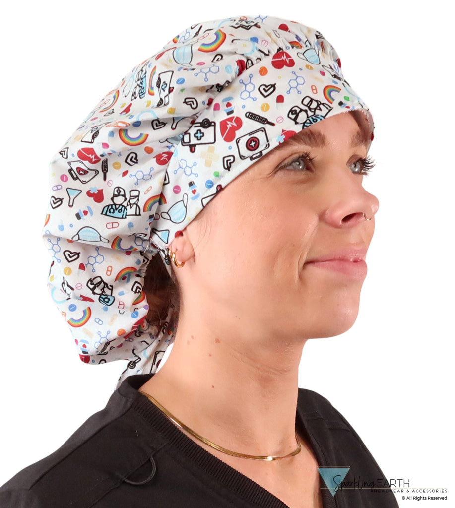 Elevate your professional look with Hope and Healing on White Banded Bouffant Ponytail Surgical Scrub Caps by Sparkling EARTH, expertly crafted to deliver both comfort and style. Featuring a spacious interior, built-in sweatband, and adjustable ties, Banded Bouffant Ponytail Surgical Scrub Caps ensure a secure and comfortable fit for any hair length. The unique ponytail option allows you to effortlessly manage your hair, keeping it neatly out of your face. Designed to provide a variety of styling options while maintaining a professional appearance, these stylish caps are the perfect blend of functionality and fashion.