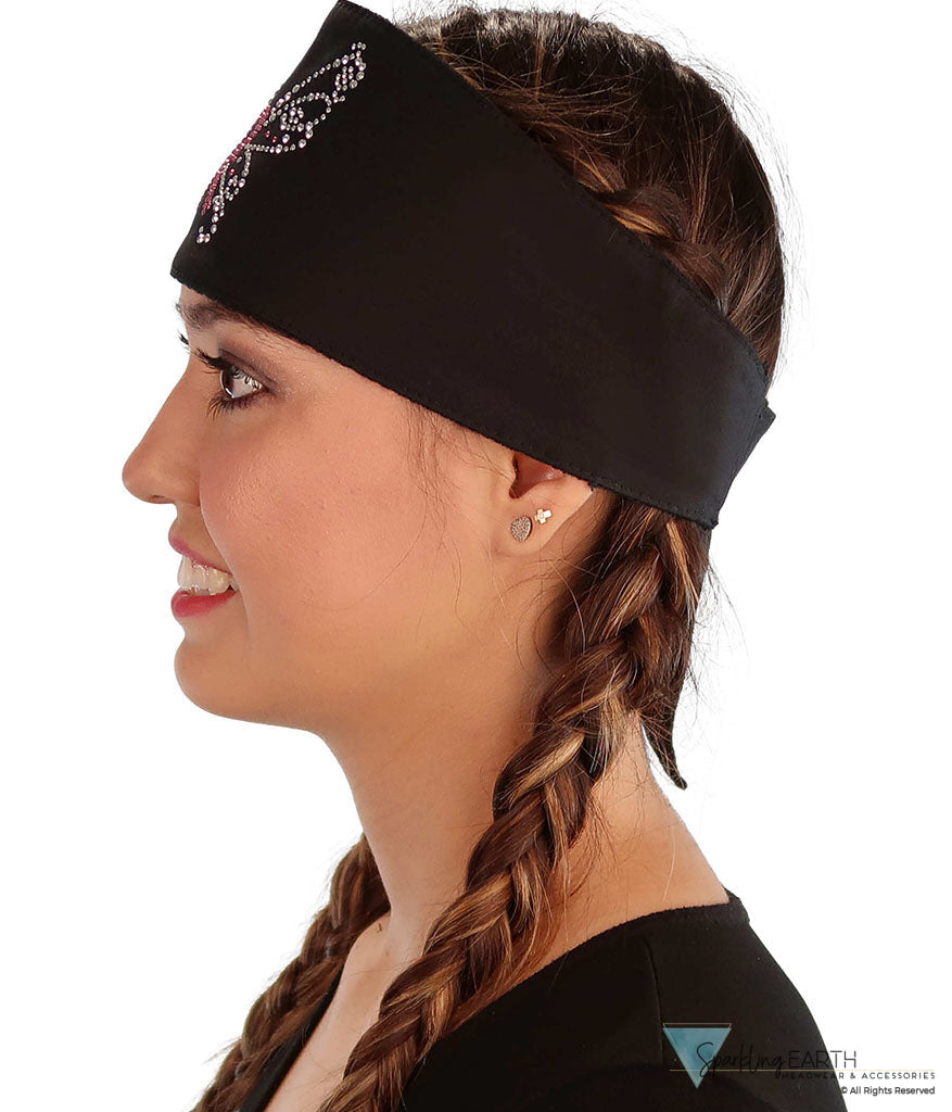 Embellished Chop Top Doo Wrap – Bold Biker Bandana with Exclusive Bling - Black Chop Top with Pink Ribbon Butterfly Rhinestud Design