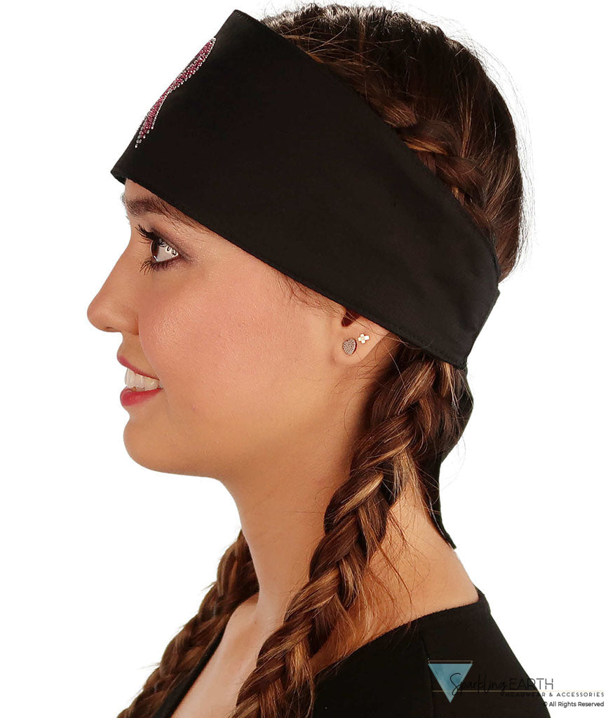 Sparkling EARTH presents the Black Chop Top Doo Wrap — adorned with a fancy Pink Ribbon Rhinestud Rhinestone Design for a bold, radiant look. These doo wraps are designed to be worn low on the brow, giving the appearance of a folded bandana. Our embellished chop top bandanas combine the ease of a pull-on design with the flexibility of an adjustable hook and loop strap to help ensure a snug and secure fit. Each chop top doo wrap features a built-in soft terry cloth sweatband for added comfort. This design keeps the chop top comfortably in place without the extra bulk of a traditional folded bandana. The tail is a double-sided fabric for a finished polished look. Perfect for long rides, on the job, or for any weekend warrior looking to stay cool and stylish.