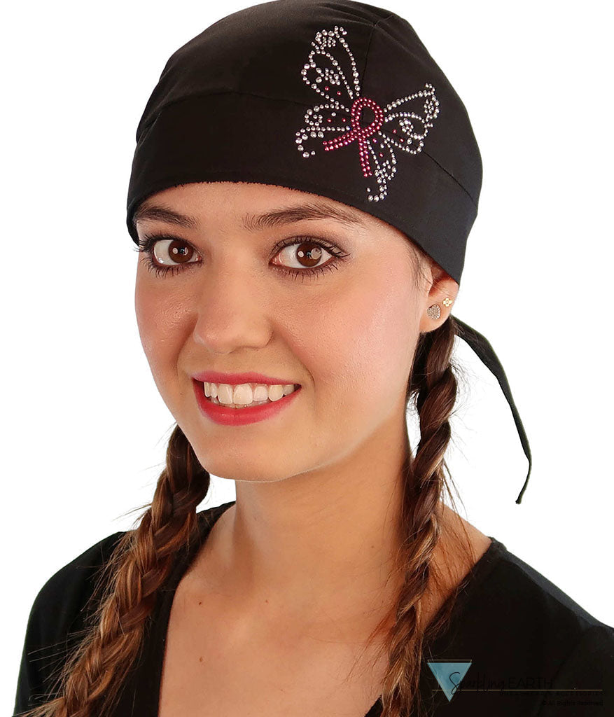 Experience all-day comfort and standout style with our high-quality cotton Skull Cap DuRags for men and women. Show support with our exclusive pink ribbon butterfly rhinestud /rhinestone embellishment on our cotton skull cap. Adorned with shimmering rhinestud details for a bold, fashion-forward look, these skull caps are proudly made in the USA. Each versatile headwrap features a built-in absorbent sweatband and an adjustable tie-back design. Ideal for work, outdoor activities, sports, or wearing under helmets, our do rags offer breathable protection, a secure fit, and a touch of sparkle wherever life takes you.