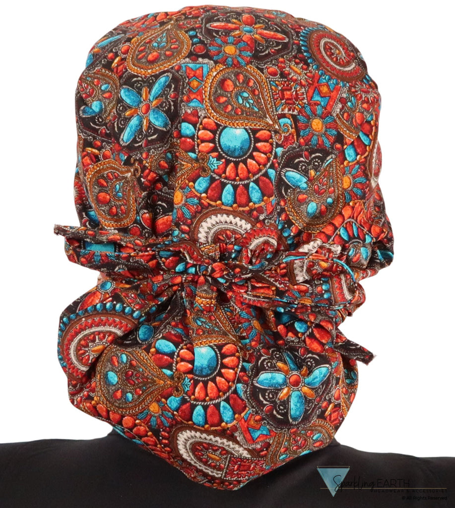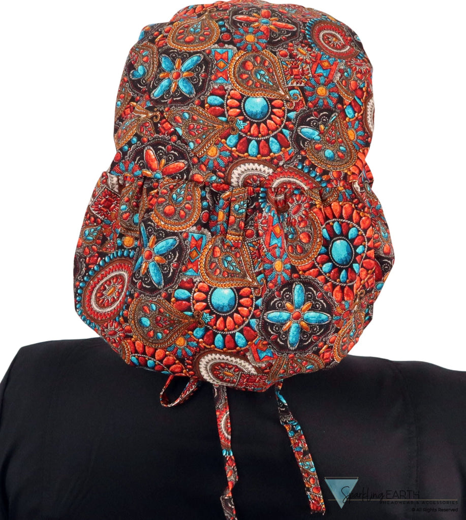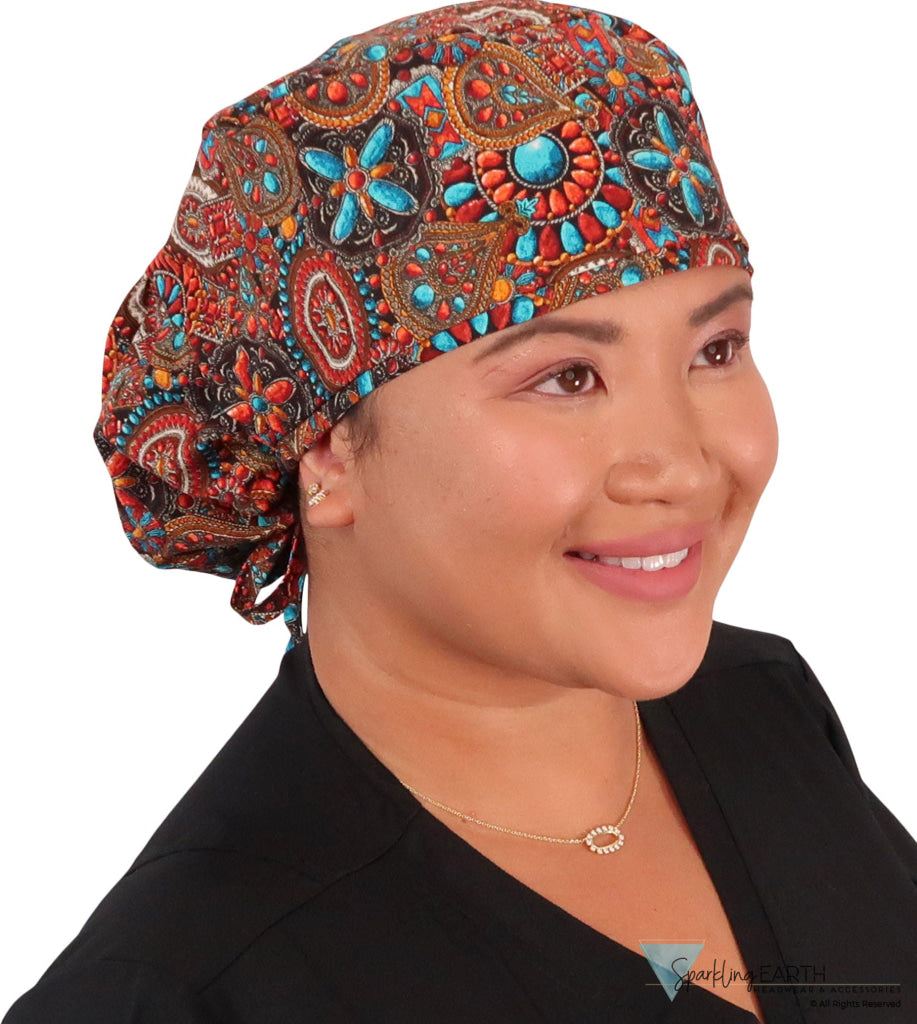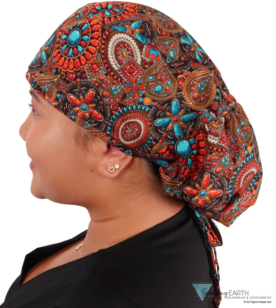 Big Hair Ponytail Surgical Scrub Cap - Perfect Scrub Cap for Long Hair - Indian Jewelry Coral