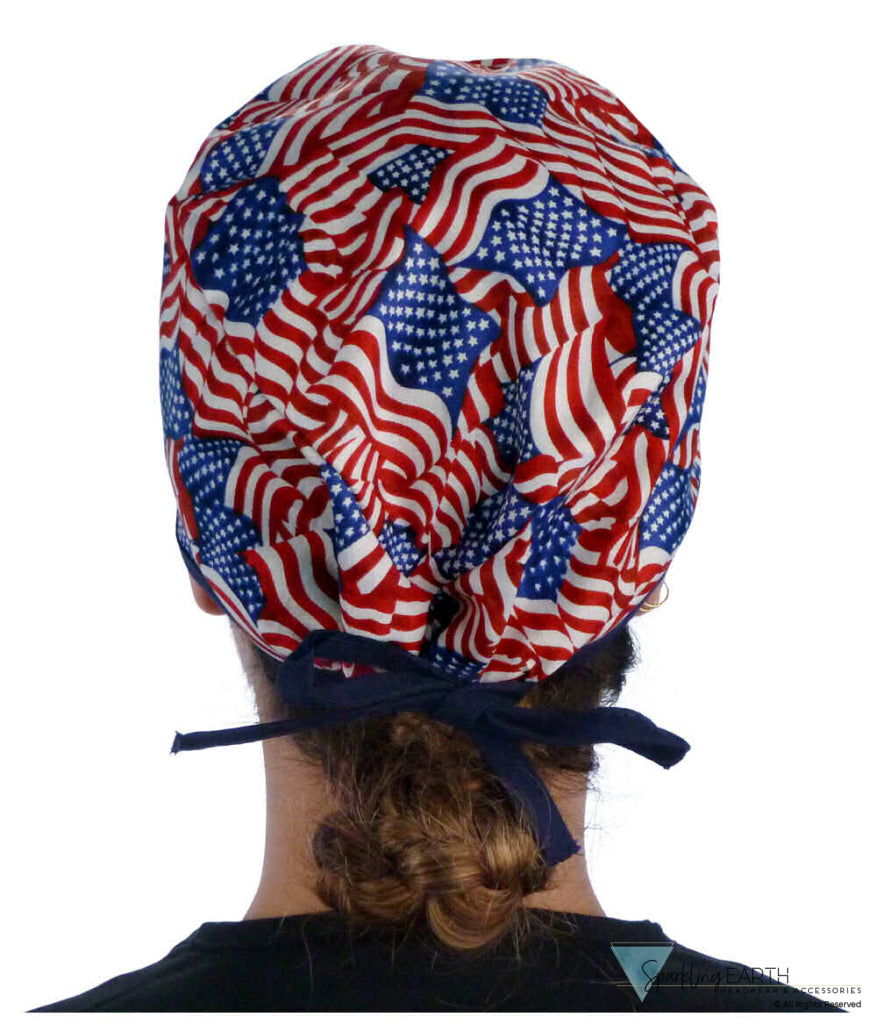 Classic Cotton Surgical Scrub Cap - American-Made with Sweatband - Small Tossed US Flag with Navy Ties