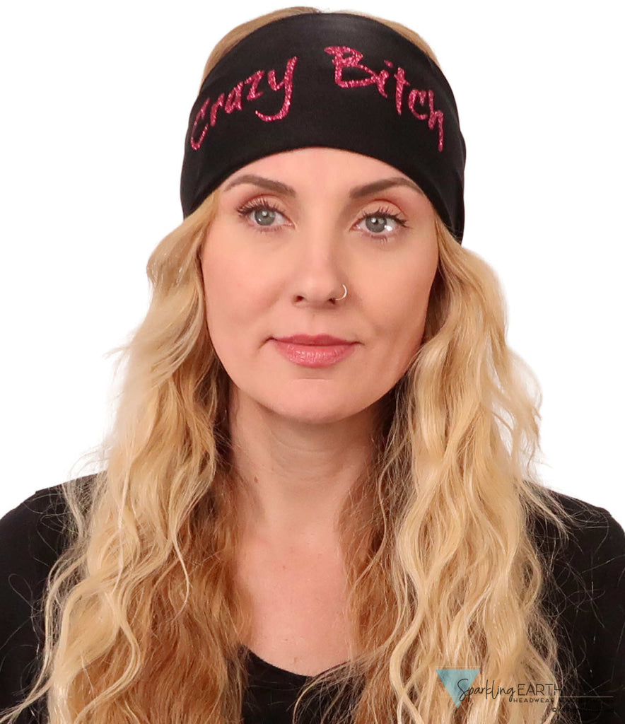 Embellished Reversible Stretch Headband – Stylish, Comfortable & USA-Made -Pink Crazy Bitch Glitter Design on Black