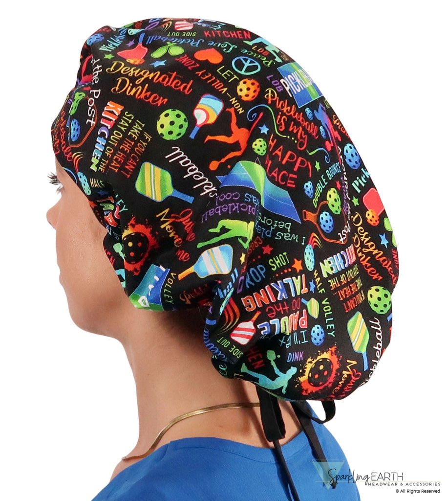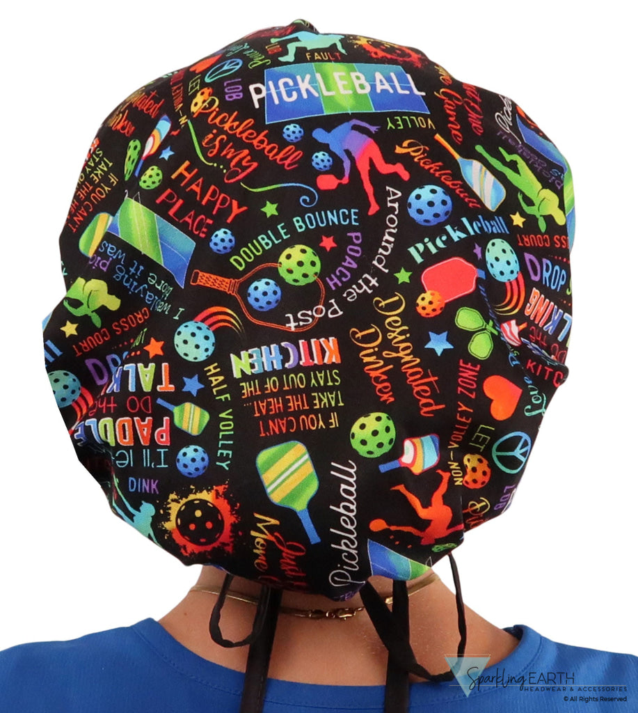Stylish American Made Banded Bouffant Ponytail Scrub Cap - Pickleball Mania with Black Ties