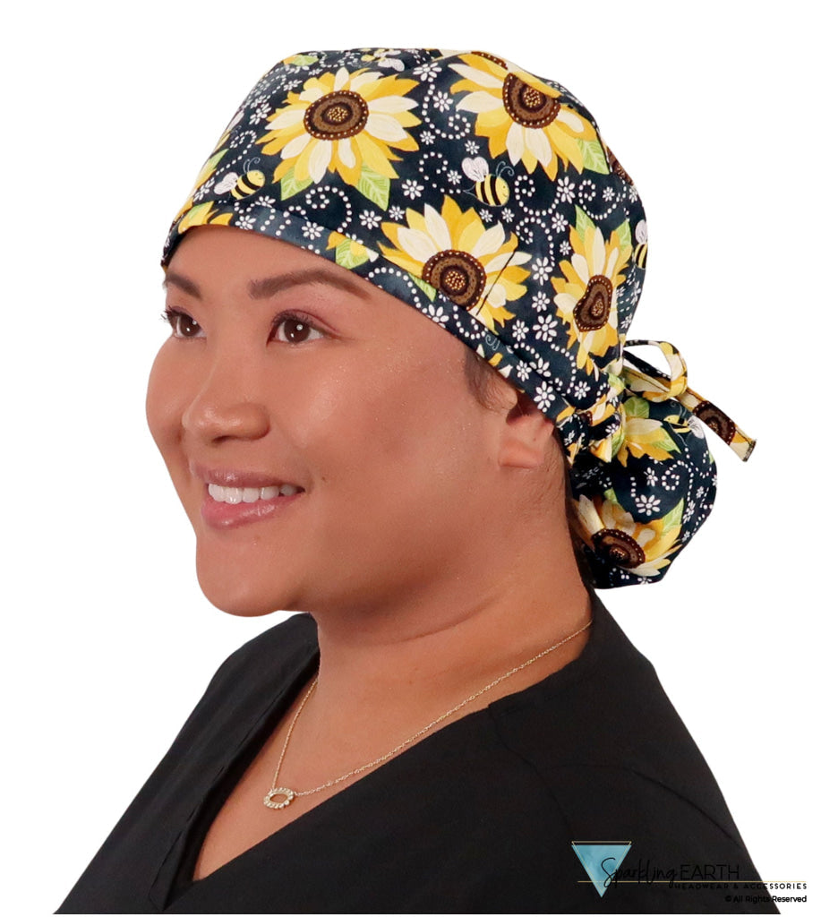 Big Hair Ponytail Surgical Scrub Caps by Sparkling EARTH are expertly designed for those with longer hair. BEEutiful Sunflower Big Hair Ponytail Surgical Scrub Cap feature a flat front and tailored back, and offer two versatile styling options. Secure your hair in a ponytail using the built-in loop or let it flow freely with a bow tied in the back.